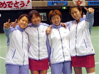 もう一方のシングルス2も竹村が実力通りの力を発揮した。予想通り優勝の行方はダブルス勝負に持ち込まれた。堀田と飯島のペアは随分うまくかみ合っているようだ。年長の堀田が若い飯島の持ち味を引き出している。決勝でもコンビネーションがかみ合い、仲島/牧田ペアを圧倒した。北日本物産は創部以来5年目のうれしい初優勝となった。