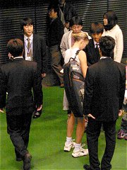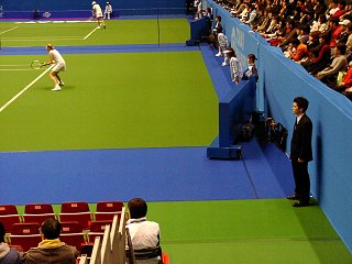 試合中は必ずコートのうしろに黒スーツのスタッフが微動だにせず立っている。姿勢は厳しく決められている様子で、両腕を体側に垂らし観客席に目を光らせている。決してコートの方へ目を向けることはない。ゲームを見ることは禁止されているようだ。こんな男が試合中ずっと立っていると、選手もうっとおしいに違いない。