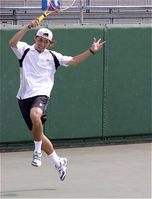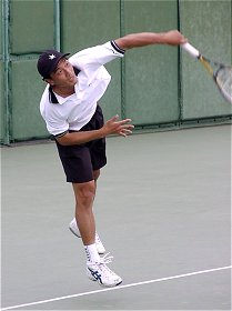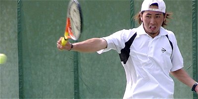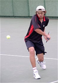 シングルス優勝の早稲田大、宮尾祥慈。決勝戦では疲れの見えた中瀬を圧倒。今日はサービスに威力があった。ダブルフォールトも多かったが、かまわずサービスを叩き込んでゲームを有利に進めた。短くなったボールはフォアの逆クロスで仕留めた。