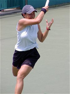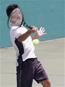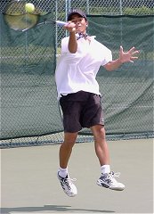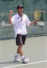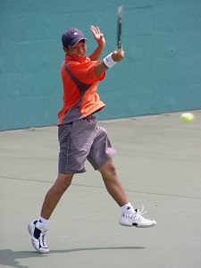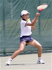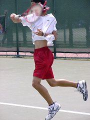 昨日はちょっと飲みすぎて頭が痛い。早めに起きて試合開始時刻を聞こうと大会本部へ電話したが通じない。勝手に10時始まりだとうれしいなと思いながら会場に向かった。えてしてこういうときは期待を裏切られる。9時試合開始だった。すでに第1セットが終わろうとしている。さすがに最終日は関係者の姿も少なくなっていた。関東ジュニアで使用しているコートは4面のみで、あとのコートは草テニス大会に占領され、おじさん、おばさんたちの嬌声が飛び交っている。それに比べ関東ジュニアの決勝は静かに熱く繰り広げられていた。