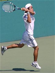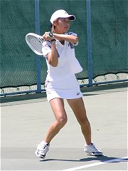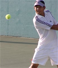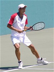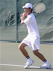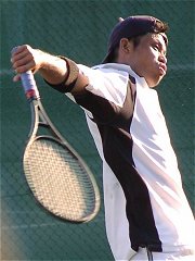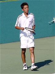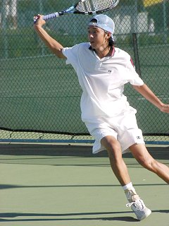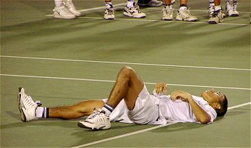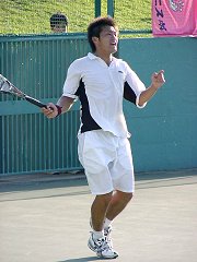 煌々と輝く照明がさらに学生達を高揚させた。逆転で勢いに乗る比嘉が5−2でサービス・フォー・ザ・マッチを迎える。しかし比嘉の足に痙攣がきてしまった。必死で我慢するがなかなか収まらない。たまらず、アンダーサーブ、無常にもフォルト。それでも最後の力を振り絞りネットへ詰める。勝った瞬間、コートに仰向けに倒れ込んでしまった。いい試合だった。