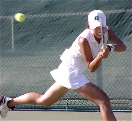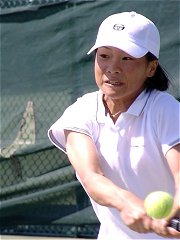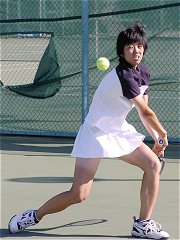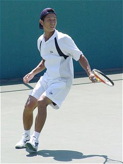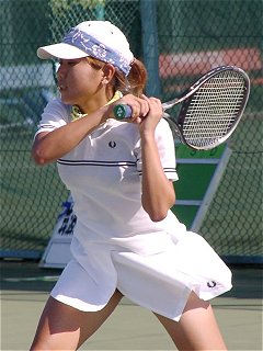 法大の畠中と亜大の比嘉のシングルスが長引いた。団体戦としてはすでに決着がついていたが、学生の応援はそんなことにはお構いなしに盛り上がる。畠中は左手首を負傷している影響で、バックハンドは片手のスライスしか打てない。それでなくてもしこるのに、スライスでつなげば否が応でも試合は長くなる。第2セットが終わったところで暗くなり、奥のコートからナンバー1コートに移動した。