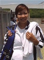 2000年 5月 4日 カンガルーカップ 第2日 半分寝ぼけた状態のベッドの中、なんとなく周りの雰囲気がおかしい。おもむろに時計を見たら、なんと10時半だ。しまった!うっかりしてアラームのスイッチを入れるのを忘れていたようだ。慌てて身支度をし、タクシーに飛び乗った。着いたらどの試合も第1セットが終わろうとしていた。遅刻は会社だけにしたいものだ。<おい 今日はシングルス2回戦に進んだ小畑沙織、宮城ナナ、吉田友佳、浅越しのぶ、井上青香の5人全てが勝ち、準々決勝に進んだ。うれしい。国内で行われる国際大会なのだから日本選手は目いっぱいアドバンテージを生かし、勝ち上がるのが望ましい。しかし残念ながら明日の準々決勝ではこの中から少なくとも2人は消える。日本人同士の対戦が2つもあるからだ。