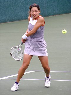 田口景子の準々決勝。打ち切れなかった昨日の反省か、試合開始直前まで男子パートナー相手にひたすらハードヒットの打ち込みをしていた。試合は6−3、6−1で勝ったが内容は昨日と同じ、決して誉められたものではなかった。何か別のことを考えながら試合をしているような感じだった。第1シードといえどもこのままでは優勝はおぼつかない。