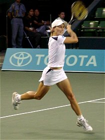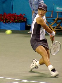 2001年 9月 18日 トヨタプリンセスカップ 本選第2日 オーダーオブプレイを見たら杉山愛のシングルスがNB15:30、続いて藤原里華の試合が組まれていた。と言うことは里華ちゃんの試合は17時ごろに始まるということだ。しめた。15時ごろ早退すれば何とか見られる。理由は何とでも適当につけよう。ついでに里華ちゃんファンの友人を誘ってみた。友人は歯医者に出かけたということにした。長い歯医者やね。 しかしチケットは1枚しかない。1試合だけ観るために2500円を払うのはもったいない。そうだ、きっと早めに帰る人がいるに違いない。チケットの半券をねだろう。まず歩道橋の上でおばちゃん2人組に声をかけた。ところがどうやらダフ屋に間違われたらしく、そそくさと逃げられてしまった。歩道橋の階段を下りるとコロシアムから続々とお客さんが出てくるのが見えた。ちょうど愛ちゃんの試合が終わったようだ。これだけ人がいれば心配なし。今度は警戒されないように満面の笑顔を作ってご夫婦に声をかけた。快く半券を譲ってくださった。やった〜 会場に入るとグッドタイミング、里華ちゃんとカラ・ブラックが入場してきた。さて、今日最後の課題をクリアしなければならない。やはりコートサイドで観なければ..ところが今日はコートサイドの降り口でスタッフがチケットをチェックしているではないか。席はがらがらなのに、せこいやつらめ。仕方なしに自由席に腰を下ろした。