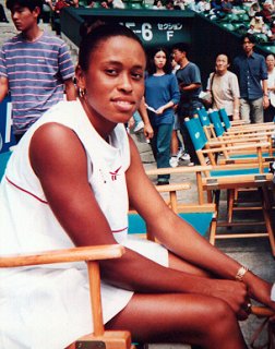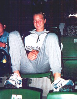 ヘンリエッタ!なんて格好してんの! すらりと伸びた足がきれいな長身のヘンリエッタ・ナギョワちゃんです。残念ながら今日は沢松選手の粘りにあって逆転負けを食らってしまいました。試合後シャワーを浴びて選手席で観戦しているところです。負けた後だったのでちょっと気が引けましたがにっこり笑ってくれました。 |