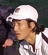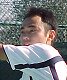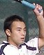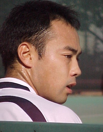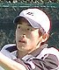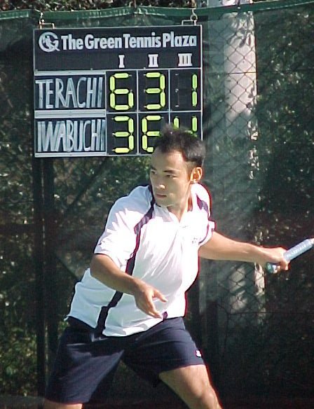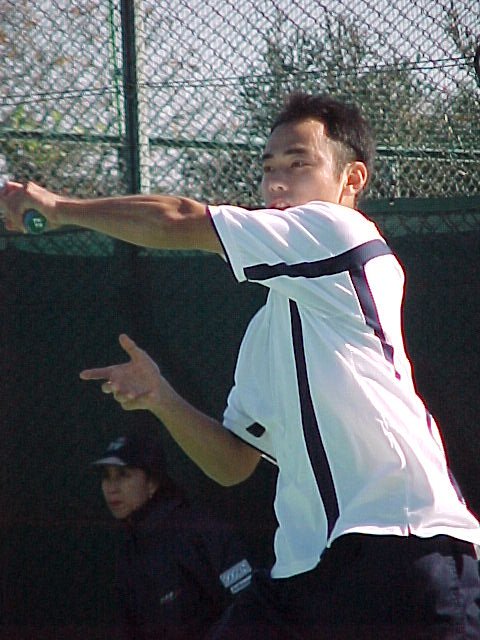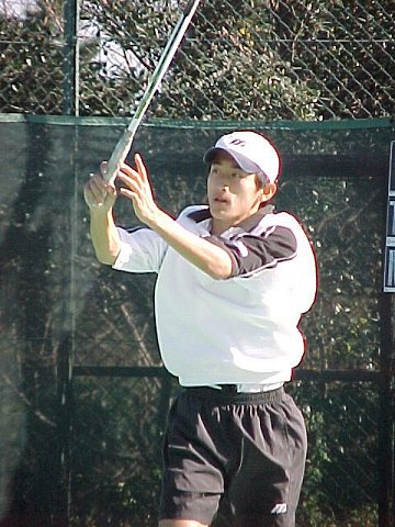 シングルス準決勝ではブチくんに 3-6,6-3,6-2 で惜敗の寺地くんです。どうもフルセットになるとスタミナ切れで、分が悪いようです。でもさすがに人気者、コギャルの追っかけが何人か観戦していました。 |