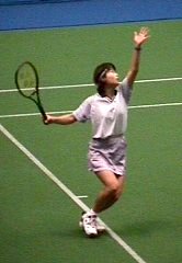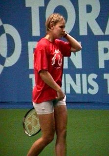| 試合が終わった後、練習を始めたアンケとリンゼイです。練習といえどもさすがにトップ10、2人のラリーは迫力満点です。期せずしてオーストラリアンオープンの準決勝で破れた2人です。お互いなぐさめあっているのでしょうか。 |