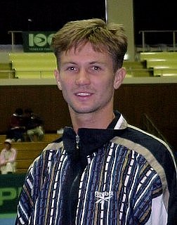 ダブルスで勝利に貢献したトマシェビッチ。 写真を頼んだら、気軽に応えてくれました。 うわさによるとヒッチハイクの達人とか。