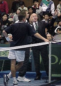 日本、崖っぷちで迎えた第4戦は貴男くんが成長の跡を日本の観衆に見せつけました。貴男くんのストレート勝ちでしたが、ブレークがあったのは第3セット終盤の1ゲームだけという、緊迫した内容でした。試合開始から2人ともひたすらサービスキープを積み重ねていきます。オゴロドフのサービスの威力は強烈で、キープする時はあっさりとキープします。特にセンターにファーストサービスが入ると手が出ません。貴男くんも途中、何回かブレークされそうな場面もありましたが、その都度すばらしい集中力で乗り切ります。前日のダブルスとは見違えるような生き生きとした動きです。2つのタイブレークもほんのわずかな集中力の差でセットを奪った印象です。もっとも、このわずかな差が、ランキングの差となって現れるのですが。貴男くんが勝った瞬間、観衆は狂喜乱舞、2対2のタイになったところで日本の逆転勝利の舞台は整いました。ほとんどの人たちは日本の勝利を予感したことでしょう。なんだ、また金子くんがおいしいところを。私も、勝利の瞬間をどんなアングルで撮ろうかと、思い巡らしていたのですが...