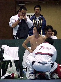 がっかりしているところではありません。勝ってほっとしているところです。下は、ピストレッジコーチと抱き合う貴男くんです。