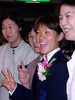 学校の先輩・後輩も来るという話だったので、もっとこじんまりしたパーティかと思ったら、なんのなんの、おえらい方がズラリ。藤沢市長のスピーチから始まって、代議士センセ、校長先生。それに、マスコミの姿もちらほら。聞いてねえよう〜。でもスピーチも終わり、乾杯したあとはこっちのもんだあ!