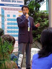 なんて言ってはいけません。主催者は神様です。まずはプロテニス日本の藤田さんのごあいさつ。