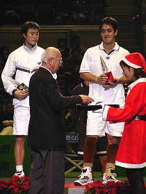 ![]() 男子ダブルス優勝は佐藤博康/原田夏希。優勝スピーチで原田選手は日本リーグを最後に引退を表明。華麗なボレーが見られなくなるのは残念。 |