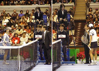 わ〜い、もめごとだ〜! しかも女子選手。あれ?レフリーはなんと八幡さんやないですか。井澤金属さん、なんて大判振る舞い! |