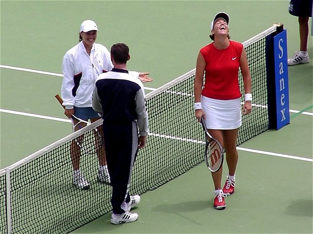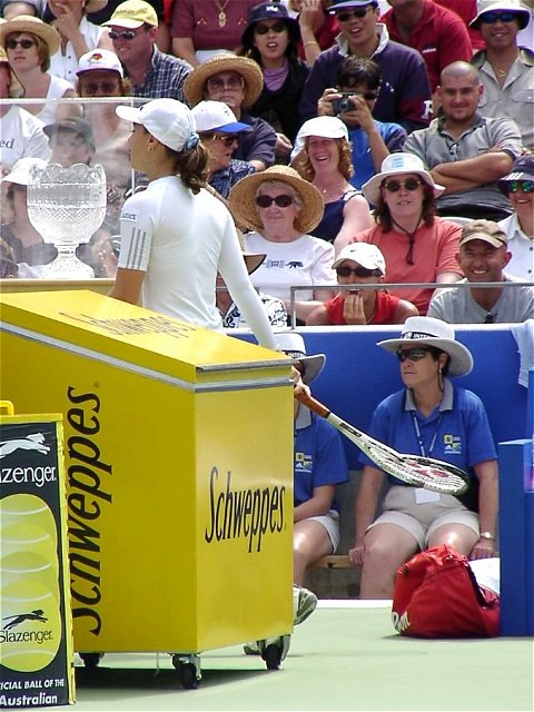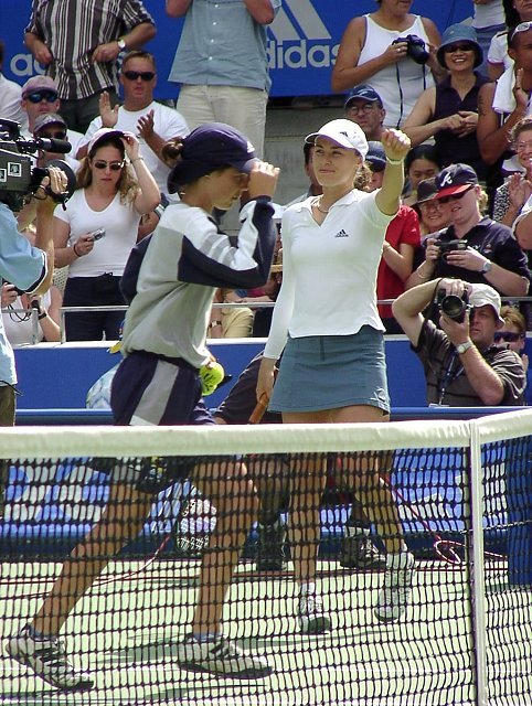 女子シングル決勝はヒンギスが新世紀の決意を高らかに宣言した。スコアは6−3、4−6、7−5。この2人が戦えば、どちらが勝とうと負けようと接戦になることは必至だ。ほんのわずかの差で勝負はどちらかに転ぶ。ほんのわずかの差をものにしたのはヒンギス。第3セット、1−4とリードされながらも粘りに粘ってチャンスを待った。ヒンギスにはダベンポートのような一発で決める大砲は持っていない。パワーのある相手には素早いコート・カバリングと巧みな戦術で相手を蜂のように刺し、次第にダメージを奪っていく。ヒンギスにはこの作戦しかないだろう。大砲に粉砕されるのが早いか、蜂の毒がからだに回るのが早いか、このくらいの差しかないように思う。