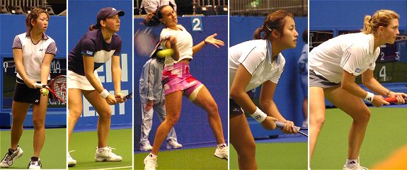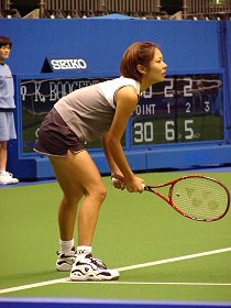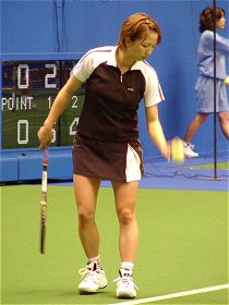 スケジュールを見て驚いた。梅ちゃんがエントリーしているではないか。よく考えてみるとあたりまえだ。この1年でランキングを200位もアップした。予選にエントリーするには十分なランキングに達していたのだ。しかし1回戦の相手は強敵インドネシアのウィーネ・プラクシャだ。からだは小さいが梅原と同じハードヒッターだ。しかも、メッチャかわいい。 試合が始まってみると梅原の出来があまりにも悪かった。ダブルフォルトを連発、リターンは再三ネットに引っ掛ける。ダブルフォルトを2回以上犯したサービスゲームが3ゲームもあった。プラクシャはサービスのコースが良く、梅原の読みをことごとくはずした。さらにタイミングの良いドロップショットなどを織り交ぜ、梅原を容赦なく揺さぶった。 |