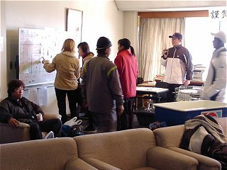 大会本部兼選手控え室。選手もスタッフも大勢たむろして、ごちゃごちゃ。まるで合宿所。ここだけは暖かい。