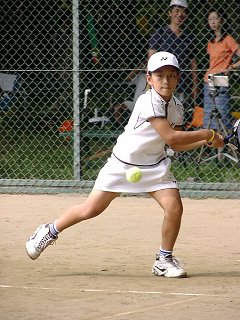 (賢明学院/大阪)関西ジュニアの時、BBSで奈良くるみちゃんより小さい子がいると話題になった。そりゃ、見ないわけにはいかない。うわ〜、ほんまにちっちゃくて、かわゆ〜い!しかし、堂々の第3シードだ。ストロークの当たりが厚く、速いボールにも打ち負けない。カウントもジャッジも大きな声ではきはきとコールする。思わず最後まで見てしまった。危なげなく2回戦突破。