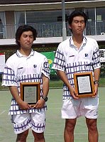 男子ダブルス優勝の須藤(左)・橋本(右)のNTT東京ペア。須藤さん、ボレーが苦手だなんて言ってたくせに、うそばっかし!(苦手のレベルが違うって)