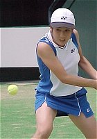 2000年 5月 3日 カンガルーカップ 第1日 夜明けとともに起きだし、岐阜のカンガルーカップへやってきた。WTA$50000大会だ。思ったより田舎だったのでちょっと驚いた。会場の長良川テニスプラザはすばらしい設備の岐阜メモリアルセンターの一角にある。陸上競技場、野球場、武道館などが同じ区域内にあり、一大スポーツセンターになっている。広々としてまことに気持ちがいい。 ただテニス会場はセンターコート以外、金網に囲まれているので決して見易くはない。今日はシングルス1回戦16試合とダブルスの予選が行われた。写真も撮りにくかったので、なんとなく集中できず、一日ぶらぶらと観てしまった。たまにはこんな観戦もいいだろう。今日、日本選手で1回戦を突破したのは、小畑沙織、宮城ナナ、吉田友佳、浅越しのぶ、井上青香の5人だ。