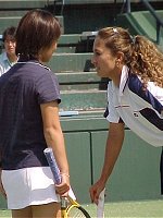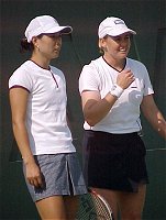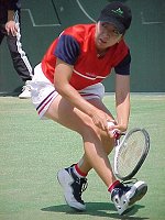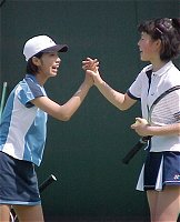 センターコートのダブルスは面白かった。4人が4人とも十二分に持ち味を発揮した。第2セットのタイブレークでは、もっと見たくなったので第3セットにもつれ込むことを期待したほどだ。観客も満足したことだろう。特に4人の中で一番小柄なプラクシャのパワーには、みんな驚いた様子だ。プラクシャは今までワイネ・プラクスヤと読んでいたが、今回ドローの表記もアンパイアのコールもウィーネ・プラクシャであったので、これからはこちらを採用する。外国名の日本語表記はむずかしい。 浅越 しのぶ/吉田 友佳 6-4,7-6(5) ジャネット・リー/ウィーネ・プラクシャ