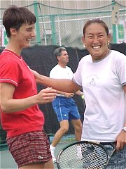 女子ダブルス世界ナンバー1ペアの杉山愛ちゃんとジュリー・アラール・デキュジ。練習は実に楽しそう。そりゃ、あんなにうまくいきゃ、楽しいわい!<ひがみ