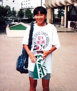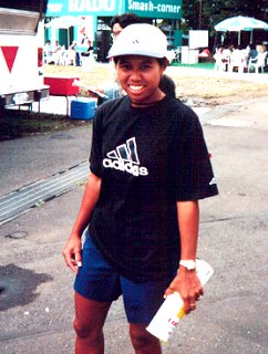 小畑沙織選手と組んでダブルスに出場した永富恵子ちゃんです。惜しくも1回戦でヘンリッタ・ナギョワ、パティ・シュナイダー組に負けてしまいました。可愛い顔に似合わず男性のようなダイナミックなフォアハンドにびっくりしてしまいました。 |