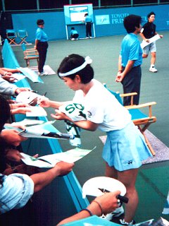 キンバリー・ポーと組んだダブルスで遠藤愛・浅越しのぶ組に勝った直後です。たくさんのファンにサインをしていたのが印象的でした。これほどサインをするのはほかにはセレスぐらいでしょうか。 |
