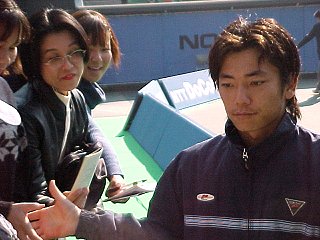 優勝インタビューを受ける石井弥起くん。宮地コータローくんを圧倒しての初優勝でした。今年は、鈴木たかおくんと一緒に海外を転戦し確実に実力を着けてきました。これからが楽しみです。 |