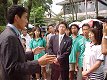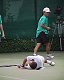 増田くんは前日に続いて、安藤将之選手に6−3、6−1の完勝、余裕の勝利でした。もう一方の準決勝で、アクシデント。山本くんと対戦中の辻野くんが左足首をねんざし、リタイアしてしまいました。かなりの重傷で、倒れてからしばらくトレーナーが来るまで、自力で動くこともできませんでした。6−0、2−1と圧倒的にリードしていたので無念だったでしょう。辻野くんの華麗なネットプレーを楽しみにしていたのにあまり観られなくてがっかりでした。(後ほど、辻野くんの怪我は骨折と判明) 突然、現れたシューゾーくんに場内は騒然となりました。間近に見ると、さすがに背が高く、さっそうとしています。テレビのコメントを収録していましたが、相変わらずの松岡節、まじめにやってんだか、受けを狙ってんだか、わからないようなところが特徴です。ダブルスの写真は石井弘樹くんと古庄大二郎くんです。プロのダブルスを観ていると信じられないような素晴らしいプレーの連続で、ぜひ一度観て欲しいと思います。 |