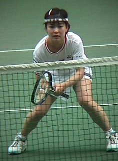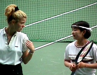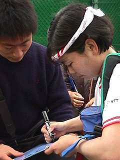 JAPAN OPEN'98 朝日生命カップ 第3日 平木理化ちゃん 久松志保ちゃんとのシングルスに勝った直後にサイン攻め。 まだ額から汗が滴り落ちています。 今日の2試合目はセンターコートで浅越・パク組とダブルス。 仲良しのエイミーと組んで息もピッタリ!