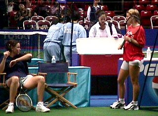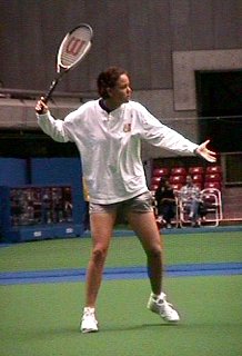 | 試合が終わった後、練習を始めたアンケとリンゼイです。練習といえどもさすがにトップ10、2人のラリーは迫力満点です。期せずしてオーストラリアンオープンの準決勝で破れた2人です。お互いなぐさめあっているのでしょうか。 |