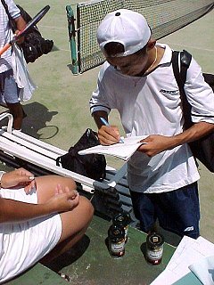 ラケットのガットにステンシルを使って、スポンサーのロゴを入れているところです。ロゴを入れないで試合に出ると罰金を取られるそうです。増田の健ちゃんも、1回戦は1ゲームしか与えない余裕の勝利でした。