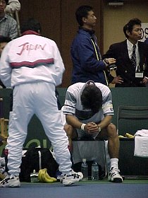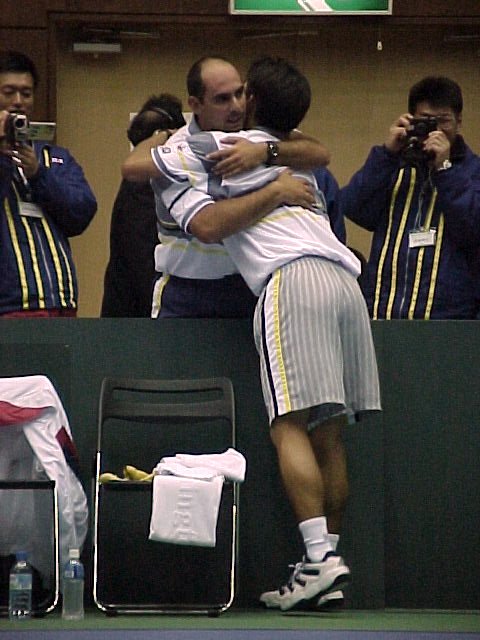 日本、崖っぷちで迎えた第4戦は貴男くんが成長の跡を日本の観衆に見せつけました。貴男くんのストレート勝ちでしたが、ブレークがあったのは第3セット終盤の1ゲームだけという、緊迫した内容でした。試合開始から2人ともひたすらサービスキープを積み重ねていきます。オゴロドフのサービスの威力は強烈で、キープする時はあっさりとキープします。特にセンターにファーストサービスが入ると手が出ません。貴男くんも途中、何回かブレークされそうな場面もありましたが、その都度すばらしい集中力で乗り切ります。前日のダブルスとは見違えるような生き生きとした動きです。2つのタイブレークもほんのわずかな集中力の差でセットを奪った印象です。もっとも、このわずかな差が、ランキングの差となって現れるのですが。貴男くんが勝った瞬間、観衆は狂喜乱舞、2対2のタイになったところで日本の逆転勝利の舞台は整いました。ほとんどの人たちは日本の勝利を予感したことでしょう。なんだ、また金子くんがおいしいところを。私も、勝利の瞬間をどんなアングルで撮ろうかと、思い巡らしていたのですが...