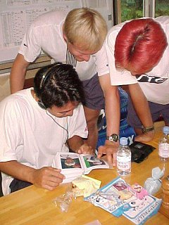 CDに飽きたらサポーターとおしゃべり。私の写真のコレクションを見ながら、ああでもない、こうでもない。マークが「この太ったやつはだれだ?」と言った時には、一同大笑い。だれかはないしょ。