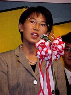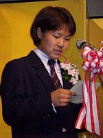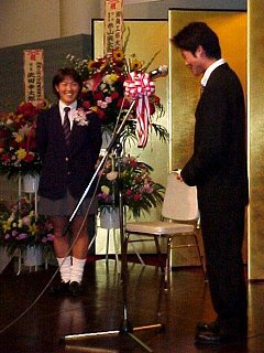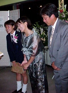 学校の先輩・後輩も来るという話だったので、もっとこじんまりしたパーティかと思ったら、なんのなんの、おえらい方がズラリ。藤沢市長のスピーチから始まって、代議士センセ、校長先生。それに、マスコミの姿もちらほら。聞いてねえよう〜。でもスピーチも終わり、乾杯したあとはこっちのもんだあ!