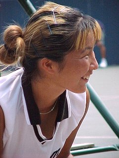 アズメディア・カップで2連覇、1週休んで臨んだ梅原は気力、体力ともに充実していた。動きも良く、時にはネットへも詰めて仲島を執拗に攻めたてた。第1セットは1ブレークされたものの6−2で先取。第2セットはさらにエンジン全開、最後には仲島は戦意を喪失してしまったようだ。インカレから続いた連戦の疲れが、ここへ来て仲島の動きを奪ってしまったのかもしれない。それにしても梅原の安定感が光った。