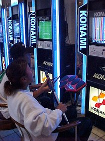 またまた潜入。プレーヤーズラウンジにずらり並んだゲーム機で遊ぶのは青山香織ちゃん。テニスはもちろん、野球、スノーボード、レース、なんでもあり。