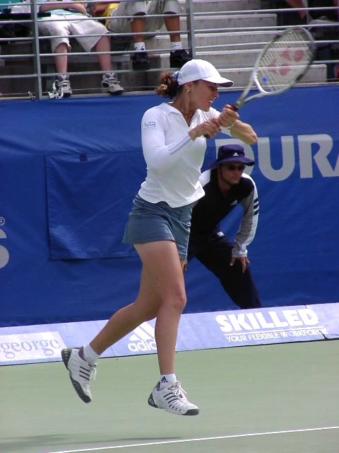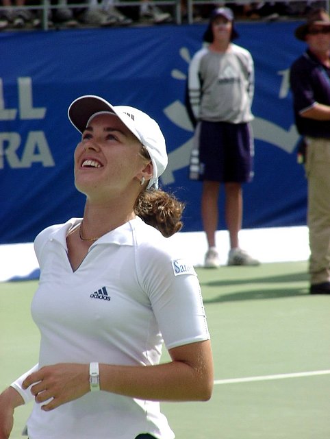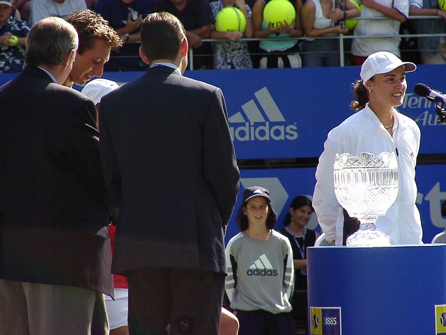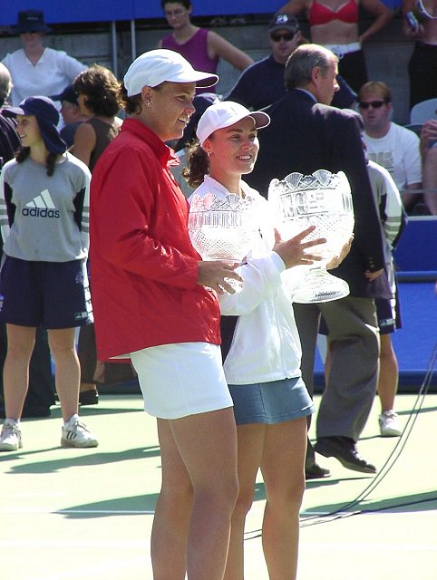 女子シングル決勝はヒンギスが新世紀の決意を高らかに宣言した。スコアは6−3、4−6、7−5。この2人が戦えば、どちらが勝とうと負けようと接戦になることは必至だ。ほんのわずかの差で勝負はどちらかに転ぶ。ほんのわずかの差をものにしたのはヒンギス。第3セット、1−4とリードされながらも粘りに粘ってチャンスを待った。ヒンギスにはダベンポートのような一発で決める大砲は持っていない。パワーのある相手には素早いコート・カバリングと巧みな戦術で相手を蜂のように刺し、次第にダメージを奪っていく。ヒンギスにはこの作戦しかないだろう。大砲に粉砕されるのが早いか、蜂の毒がからだに回るのが早いか、このくらいの差しかないように思う。
