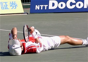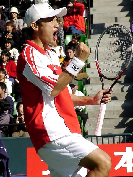 シングルス決勝も大詰め、寺地は第1セットを6−4、第2セットも5−2とリードし勝利を目前にしていた。ゲームカウント40−0、あと1ポイントで決着はつく。昨日の轍は踏むまい。本村との準決勝で試合開始から10ゲーム連取したあと、強引に力でねじ伏せようとして無理を重ね、危うく逆転されるところだった。一呼吸おいて慎重にサービスポジションに入った。この時、寺地の脳裏には3年前のある約束が浮かんでいた。 1998年8月、寺地はじりじりと焼け付くような砂入り人工芝のコート上で喘いでいた。アズメディアカップ準々決勝、対戦相手はスタミナ抜群、あの増田健太郎だった。フルセットに持ち込んだものの、容赦のない増田の振り回しと真夏の太陽に焦がされて、正気を失いかけていた。けいれん寸前の右足を引きずりながら、なんとか最後まで戦ったが、終わった時にはKO負けのボクサーのように首をうなだれていた。完敗だった。プロになれば高校チャンピオンの肩書きなど、何の役にも立たないことを実感していた。テニスには勝者と敗者しかいないのだ。 この時、親子ほども歳は違うが、針金のようにやせっぽちの若者が必死にボールに喰らいついていく姿に魅せられた一人の女性がいた。彼女は軽い気持ちで「優勝したらラケット下さいね。」と冗談とも本気ともつかぬ約束をした。寺地は「分かりました。」と型通り答えた。その後彼女は、寺地の試合があればできるかぎり足を運んだ。およそ約束とは言えない他愛もない会話は次第に記憶の中から薄れていった。 3年後の、有明コロシアム.. 寺地は静かにトスを上げ渾身の力を込めてサーブを放った。石井弥起は一歩も動くことができず、寺地は雄叫びを上げコート上に倒れこんだ。起き上がって最初に駆け寄っていったところは母親ではなかった。コートサイドで応援していた一人の女性に近づき、ウィニングラケットを手渡した。この瞬間、記憶の彼方に消え去ろうとしていた小さな約束が成就された。 |